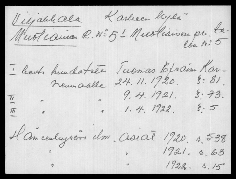 ”’Muotiainen on sijainnut aluksi ns. Kumpulan mäellä lähempänä rantaa. Muotiainen on ensimmäisiä kantataloja Karhejärven alueella, se on perustettu v. 1598’ Jussila & al 2009: Paikannus ehkä hieman epätarkka, mutta varsin todennäköinen. Peltoa ja osin metsää. Ei jälkiä vanhasta rak. Jos ollut mäen päällä (pohjoisempana) niin siellä rakennus ja piha. Yksittäistalona ja oletettavasti suurimmaksi osaksi tuhoutuneena ei muinaisjäännös”