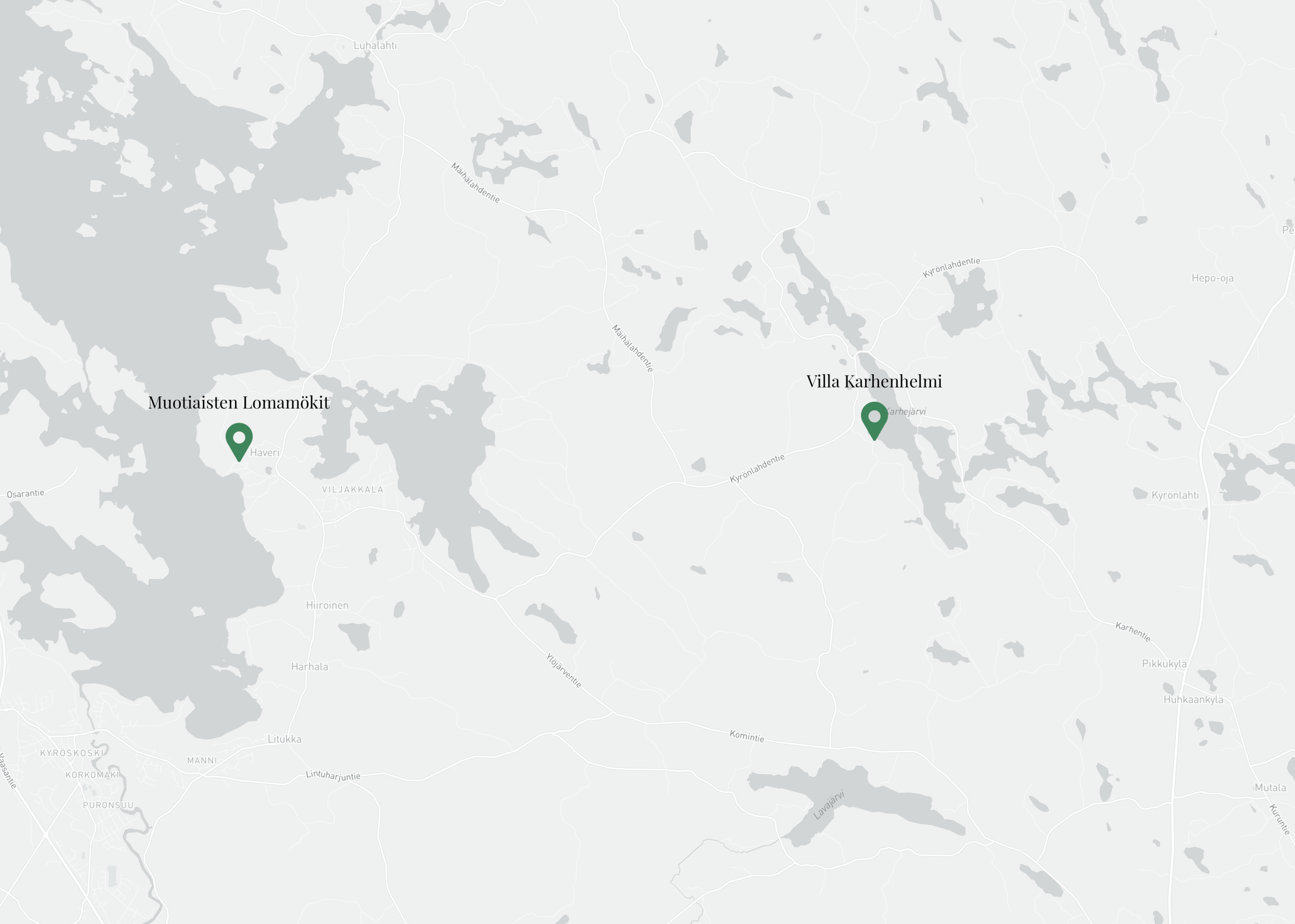 Huvilamme sijaitsevat kahdessa eri paikassa ylöjärvellä. Viljakkalassa ja Karhella. Kaivoskartano, Kultakartano sijaitsevat Viljakkalan haverissa, kun taas kesämökit sekä Villa Karhenhelmi ja Villa Karhentimantti Karhella. Muotiaisten kartano on sijainnut Karhejärven rannalla ja sillä on mielenkiintoinen pitkä historia alueella. Lue lisää täältä.